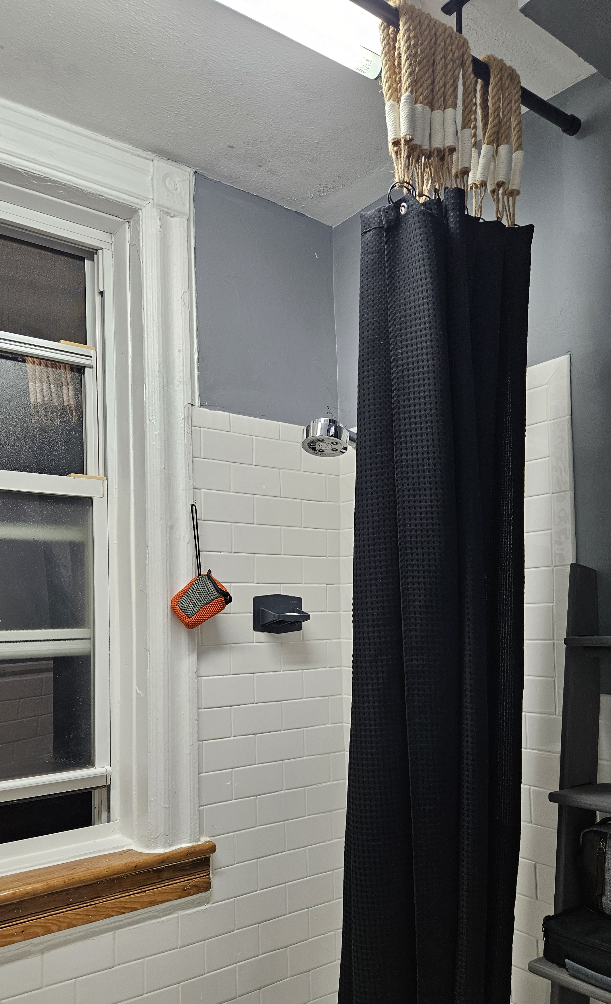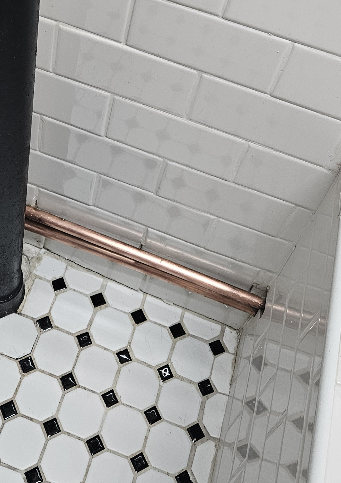 Full Coherence: You can begin to see things coming together with just 3 or 4 elements in 1 small bathroom. The restored and sealed window sill (now functional shelf), copper, riser, and curtain rod all come together. We did not include the vanity. Come back for more shots - we are working on our photo and portfolio game ;)