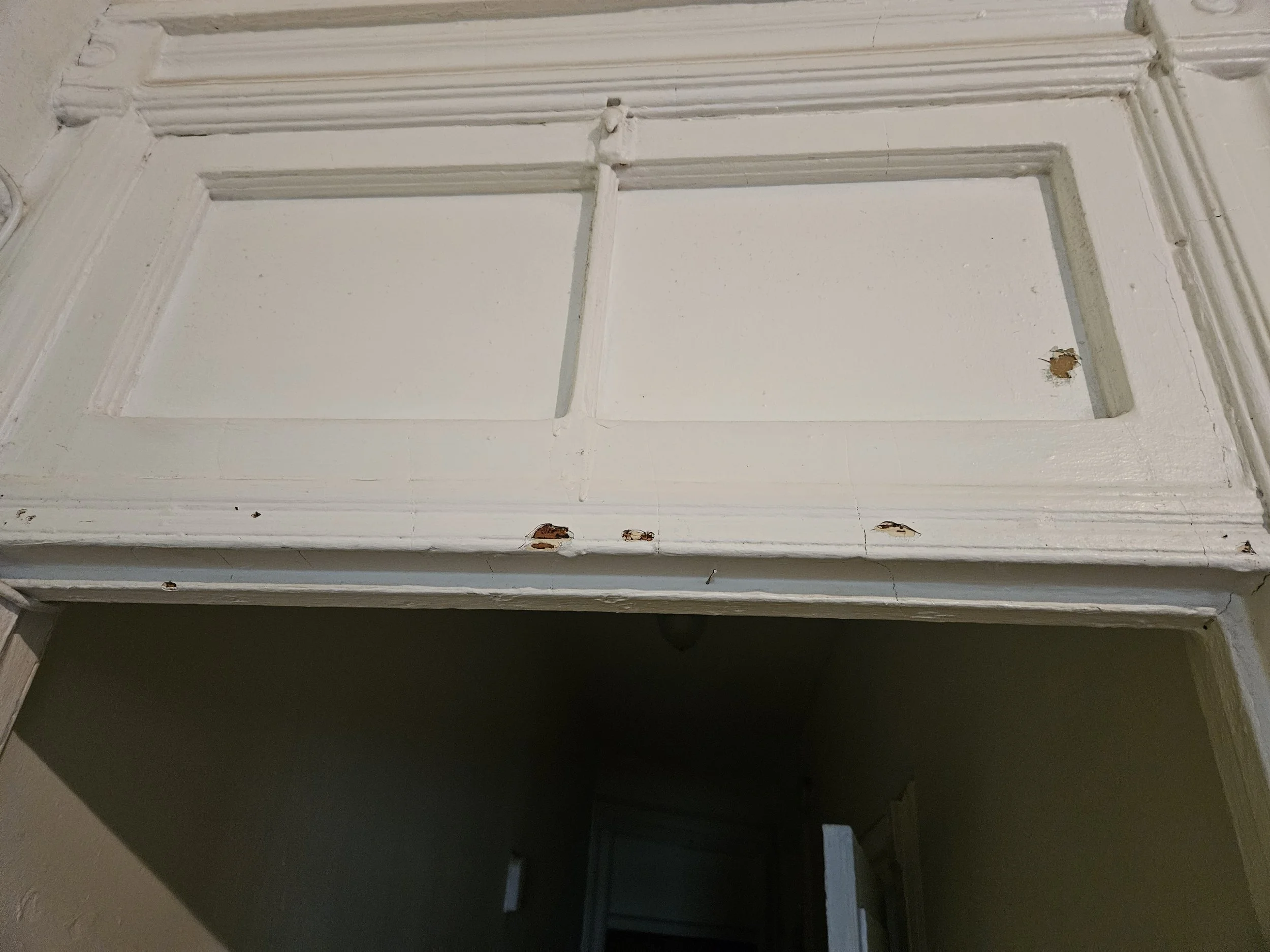 Before: Covered transom and hardware gone to waste that additionally smothers lite and spatial flow.